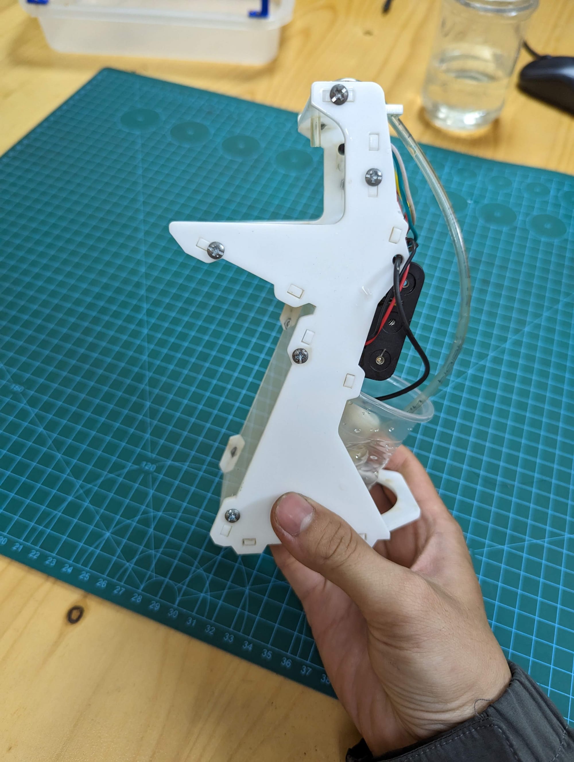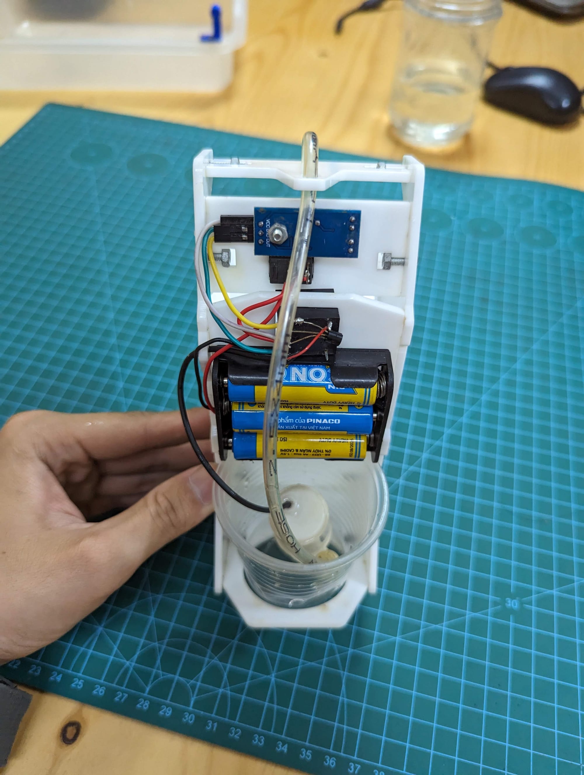 🍀Mô tả hoạt động: khi có tay đưa vào mắt cảm biến, bơm sẽ bơm nước lên xịt vào tay, khi lấy tay ra bơm sẽ dừng ngay.